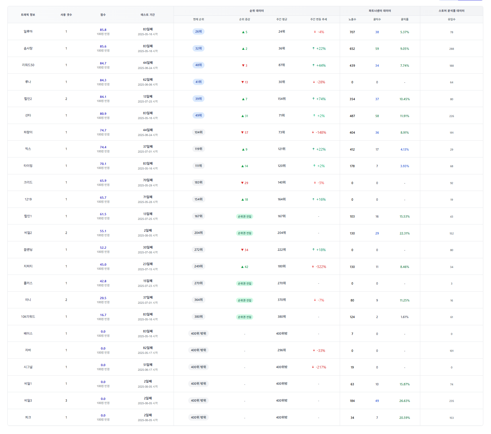 클릭률, 전환율, 유입 수 모두 고르게 우수하며, 사용자 반응이 안정적으로 유지되고 있습니다.