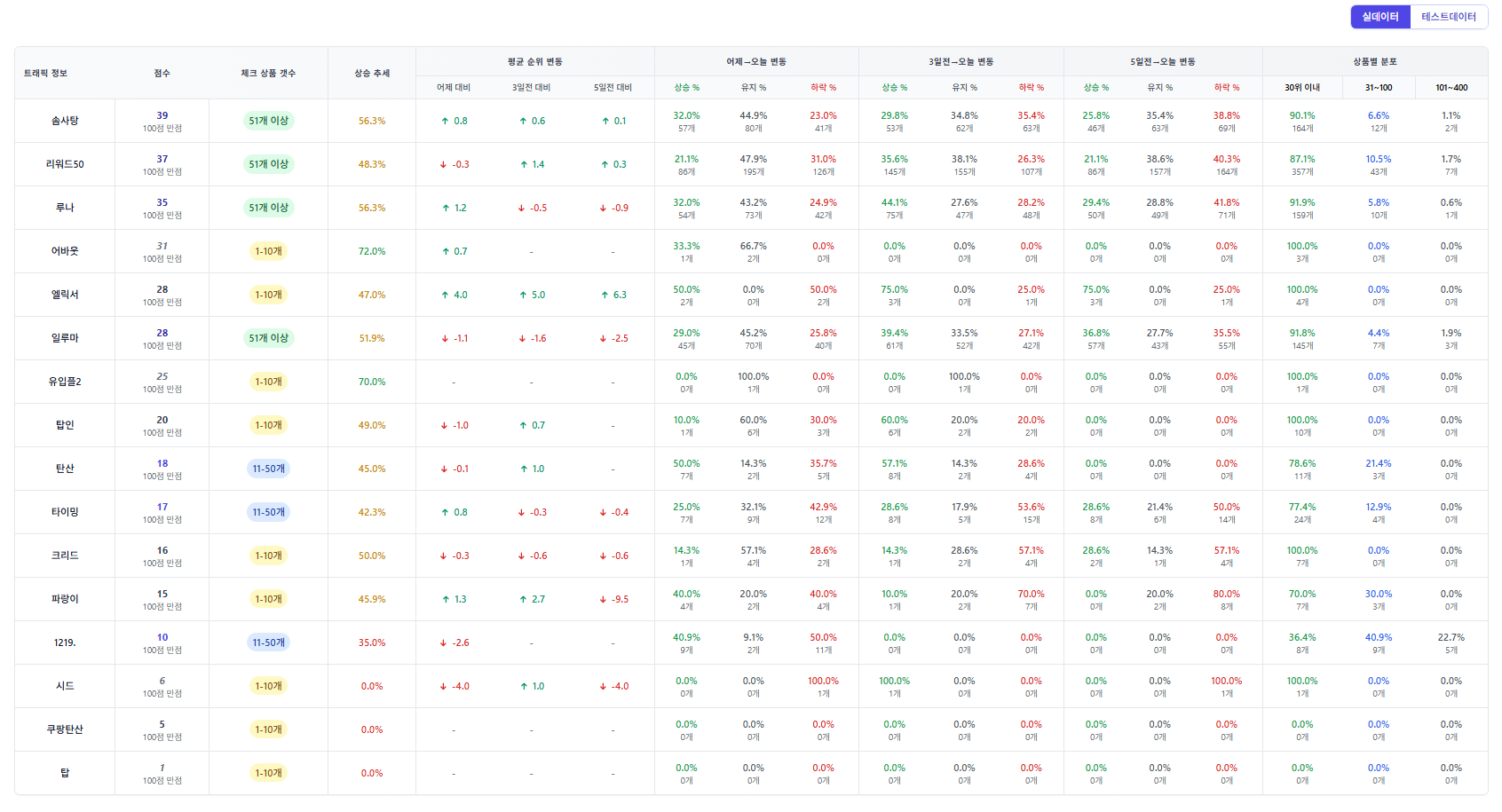 👉 솜사탕, 리워드50, 루나가 안정적으로 상위권을 지키고 있으며, 특히 엘릭서는 최근 상승 모멘텀을 크게 확보한 것이 눈에 띕니다.