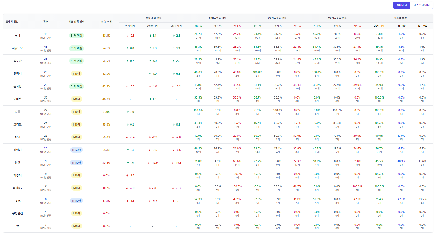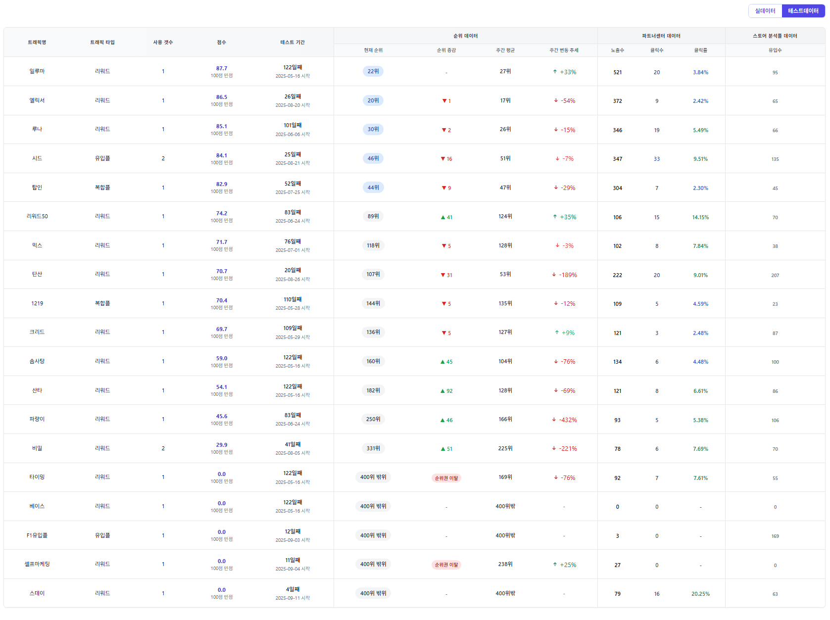 안녕하세요! 오늘도 네이버 리워드 광고 데이터를 기반으로 실데이터와 테스트데이터 순위를 정리해보았습니다. 광고 효율을 고민하시는 분들께 도움이 되길 바랍니다. 😊