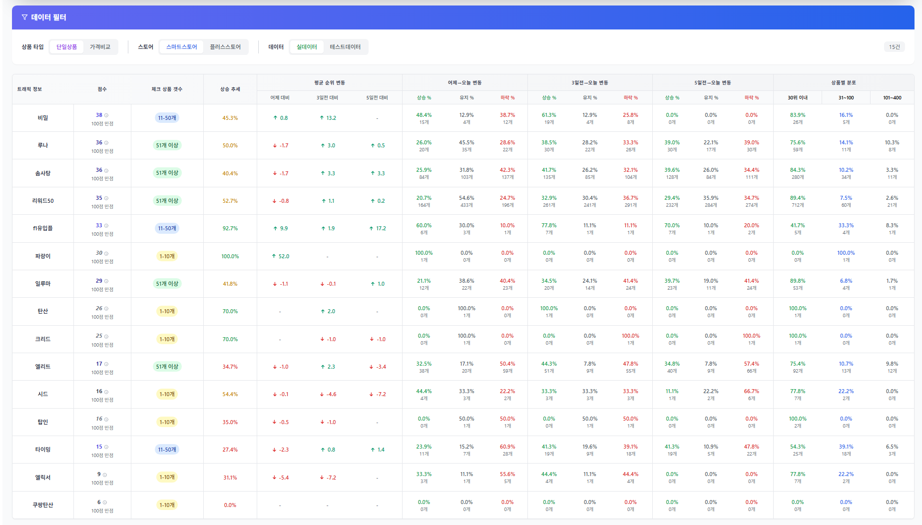 - 상위권 유지율: 상위 10위 내 상품 중 ‘비밀’, ‘솜사탕’, ‘엘리트’의 순위 안정성이 두드러졌습니다.