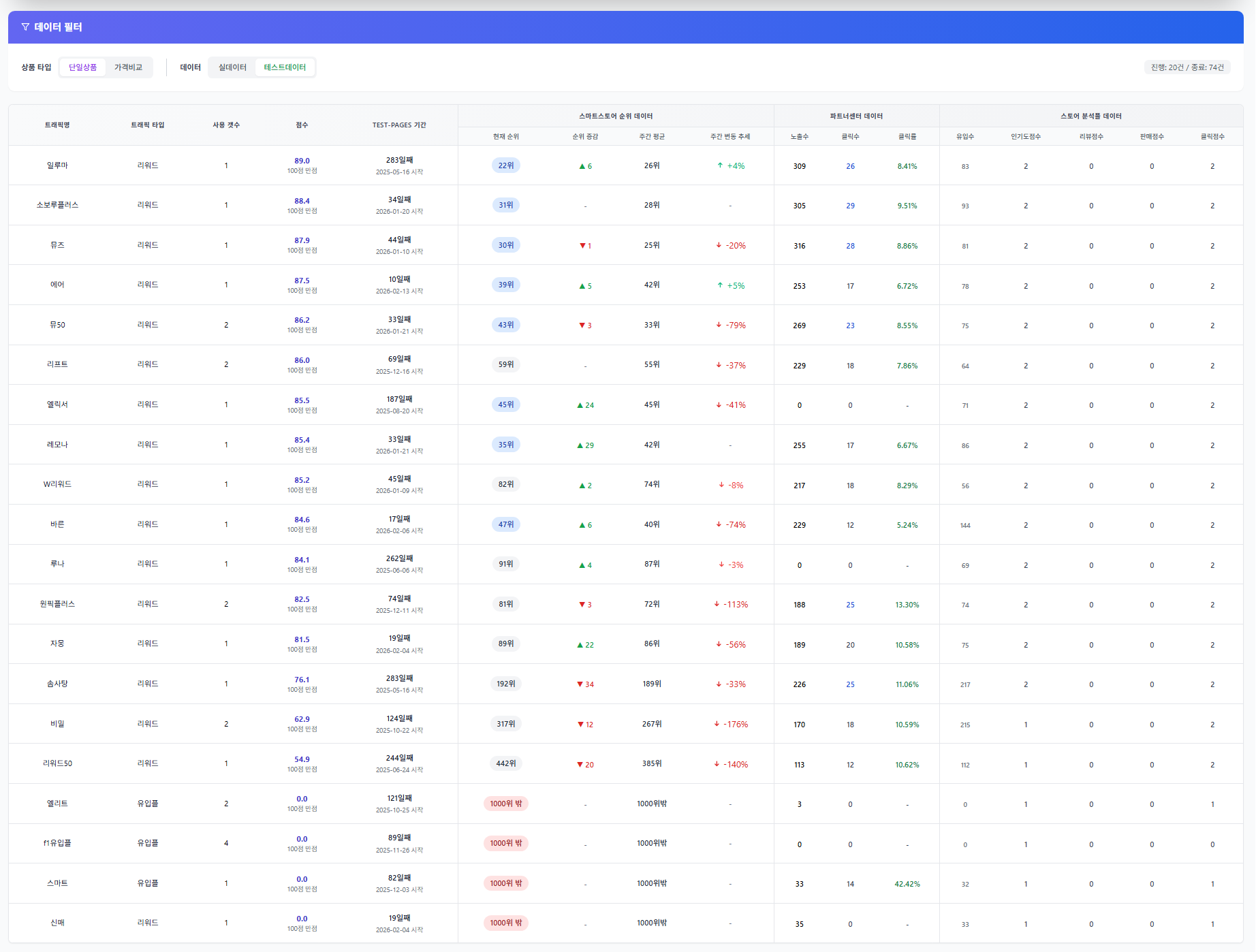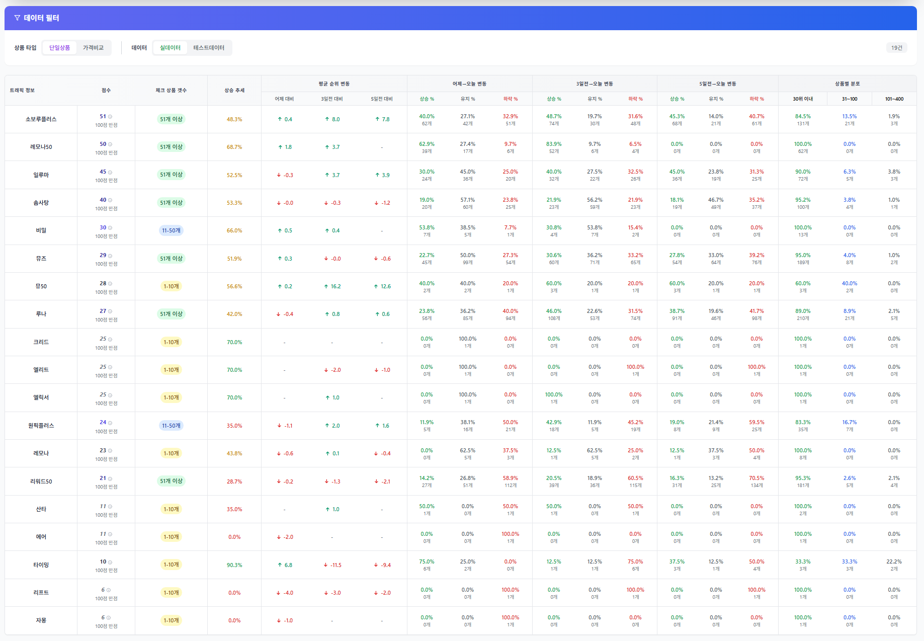 특히 실데이터 CTR과 유입수가 상위권 순위를 견인하는 모습이 뚜렷합니다.