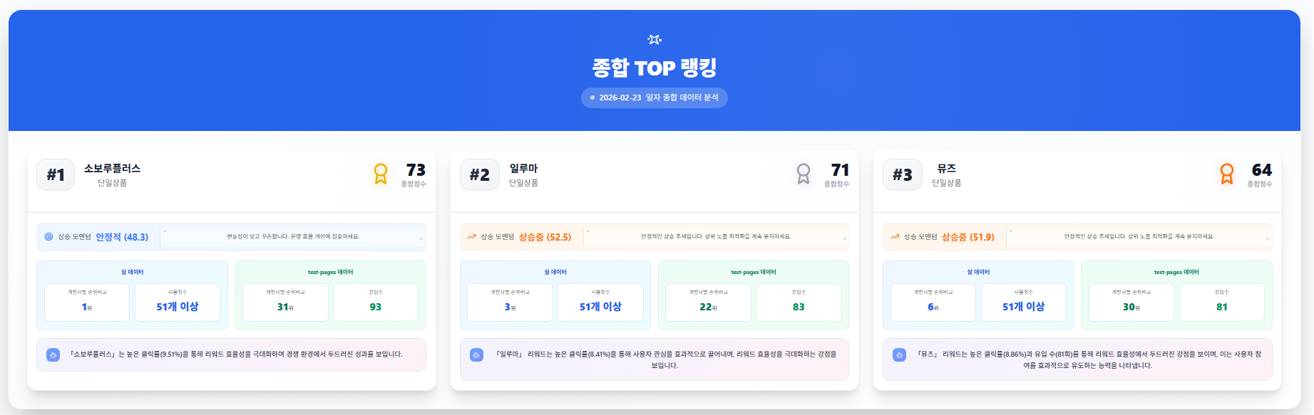 - 소보루플러스 → 실데이터 1위 유지, 안정형 리더