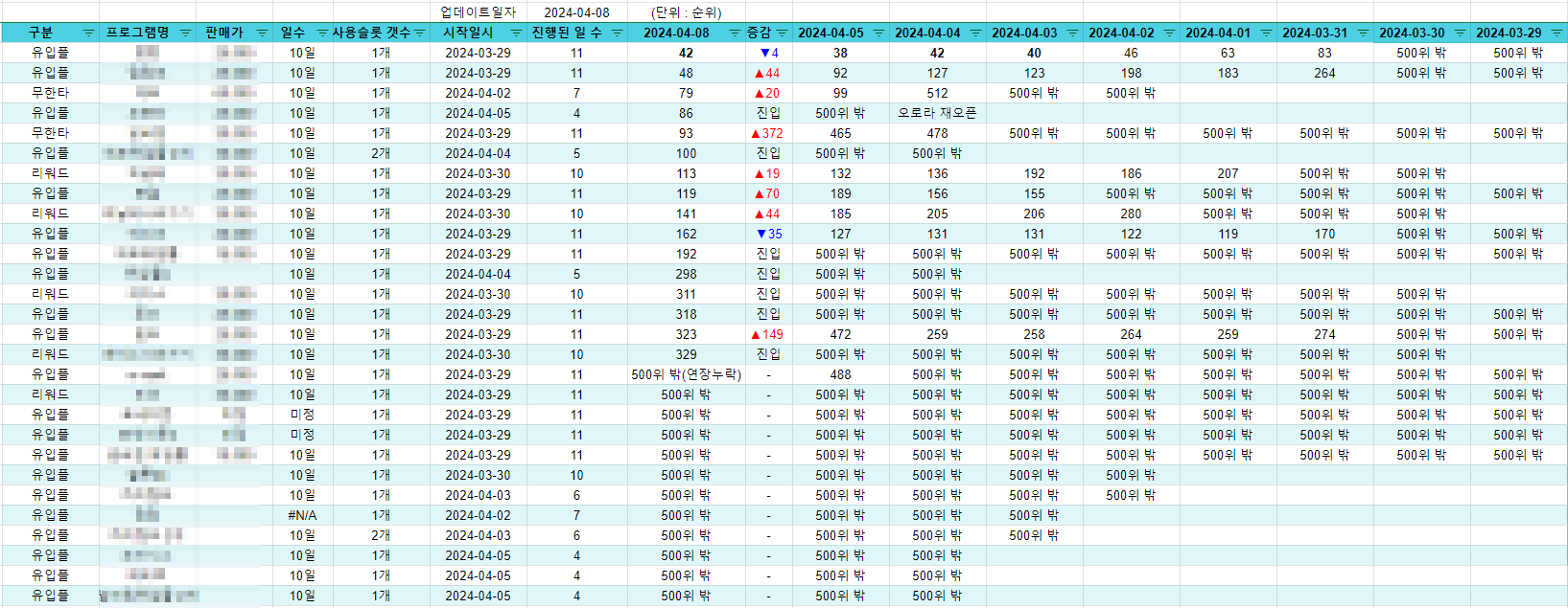 ※ 테스트 상품마다 프로그램별 트래픽 1개 혹은 단가가 낮을 경우 2~3개 정도 작업을 걸어 동일한 메인키워드 기준에서 순위를 나열하여 정리할 계획이다.